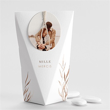 Monfairepart vous propose de mettre en valeur votre contenant à dragées grâce à une technique d'impression luxueuse : la dorure à chaud. Ajoutez sur votre boîte à dragées un texte doré, argenté ou cuivré, pour un rendu haut de gamme. Vos contenants à dragées peuvent également être accessoirisés grâce à des rubans en satin de la couleur de votre choix, ou des ficelles en matière naturelle. Pour faire le bon choix, pensez aux éléments qui composent votre décoration de table, ainsi qu'au thème que vous avez choisi !