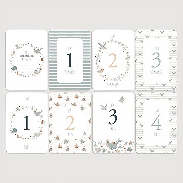 La carte étapes bébé est un peu comme un livre de naissance mais avec une manière différente de photographier la vie de votre enfant depuis sa naissance. À ce titre, nous vous conseillons d'envisager l'achat de votre carte étapes bébé avant la naissance de celui-ci ou de l'inclure dans votre liste de naissance en guise de cadeau original qui vous sera offert au sortir de la maternité pour ne pas perdre un seul des bons moments à venir avec votre enfant. Parmi le catalogue de notre boutique en ligne, la carte étape bébé est disponible par lot dans des thèmes variés. Faites donc votre choix pour créer le souvenir parfait : des animaux dans les bois, des motifs fleuris, le thème marin, jungle ou encore celui de la ferme.