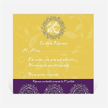 Inutile de parcourir des kilomètres à la recherche du modèle de carton réponse mariage idéal et à petit prix : il se trouve dans la collection Monfairepart. Vous pouvez profiter de votre temps libre pour vous consacrer à d'autres préparatifs autour de votre mariage, comme par exemple peaufiner votre wishlist ou choisir le menu qui épatera vos convives... Une carte de réponse mariage est disponible pour chaque modèle de faire-part de notre collection, idéalement assortie, et toujours personnalisable au gré de vos envies. Grâce à notre outil de personnalisation, vous prendrez autant de plaisir à la créer qu'à choisir ses options de finitions !