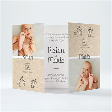 Avec un format 2 volets vous pouvez laisser libre cours à votre imagination. Avec suffisamment de place, à l’intérieur comme à l’extérieur, n’hésitez pas à soigner le texte de votre faire-part ou de multiplier les photos de votre bébé que vos proches découvriront à l’intérieur comme à l’ouverture d’une pochette surprise. C'est bien le format idéal pour positionner deux photos ou plus.