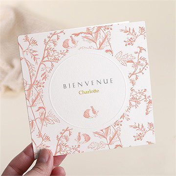 Au-delà du choix du papier, ce sont les finitions qui donnent à votre faire-part son caractère unique. La dorure à chaud dépose un film métallique étincelant sur lettres, motifs ou contours, tandis que le gaufrage crée un relief délicat, qu’il s’agisse d’un contour autour du prénom ou de l’empreinte d’un petit lapin, ajoutant une dimension tactile et visuelle à chaque carte.
