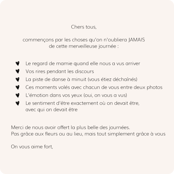 Merci pour ces moments de bonheur et pour tous ceux que nous partagerons à nouveau ensemble dans les années à venir…"