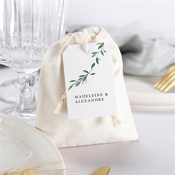 • Un pochon de dragées en tissu avec une étiquette assortie à votre faire-part de mariage